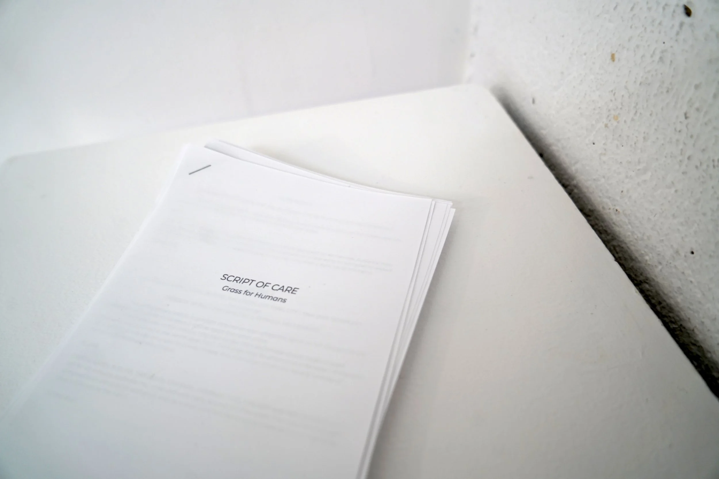 The play is written for an exhibition lasting 1 week or longer. The characters in the play mostly consist of non-human beings (except for the groundskeeper and the visitor) but are referred to as characters as they are living entities. They are meant to be installed in the centre of the room approximately 2 metres apart from each other so when a visitor picks up a script, they are given the space to enter and engage with the characters. Touching is permitted.